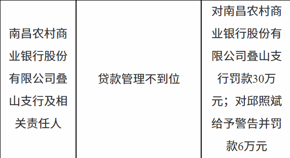 11月14日,国家金融监督管理总局江西监管局行政处罚信息公开表显示,南昌农村商业银行股份有限公司叠山支行及相关责任人因贷款管理不到位被罚款30万元;邱某斌被给予警告并罚款6万元。