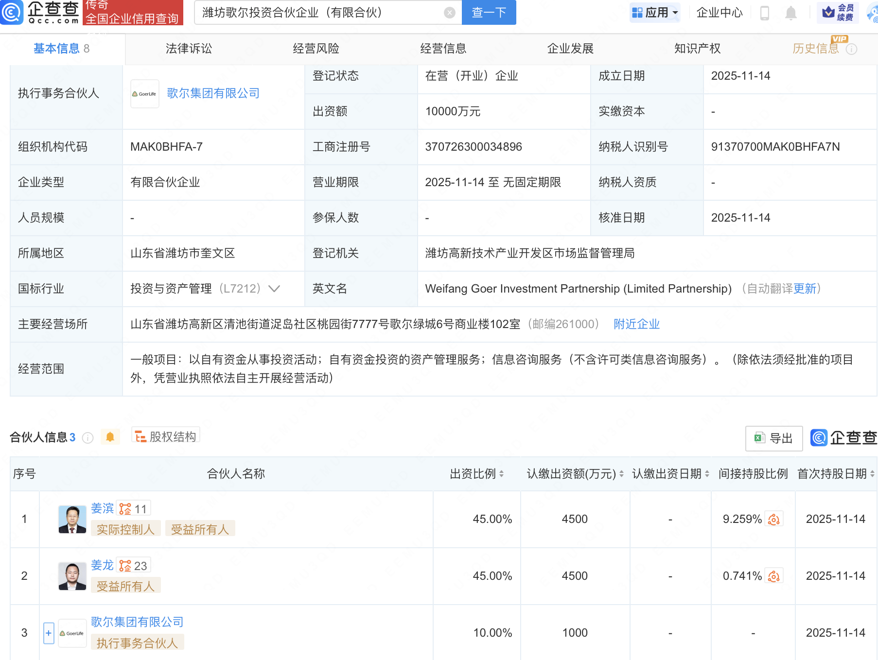 近日,潍坊歌尔投资合伙企业(有限合伙)成立,出资额1亿元,经营范围包含:以自有资金从事投资活动;自有资金投资的资产管理服务;信息咨询服务(不含许可类信息咨询服务)。企查查股权穿透显示,该企业由歌尔集团有限公司等共同出资。