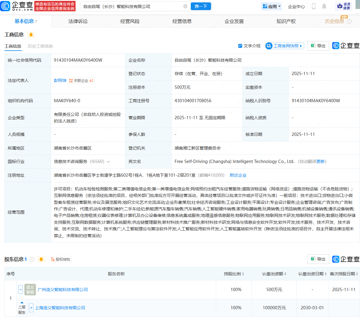 近日,自由自驾(长沙)智能科技有限公司成立,法定代表人为彭照坤,经营范围包含:新能源汽车整车销售;汽车销售;人工智能硬件销售;地理遥感信息服务;人工智能应用软件开发等。企查查股权穿透显示,该公司由哈啰Robotaxi关联公司上海造父智能科技有限公司间接全资持股。